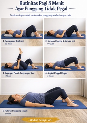 Solusinya sederhana: lakukan rutinitas gerak ringan selama delapan menit setiap pagi untuk membantu melonggarkan sendi, mengaktifkan otot penopang tubuh, dan menyiapkan punggung menghadapi aktivitas harian.