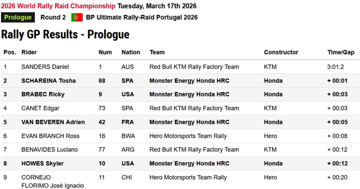 Pembalap asal Australia, Daniel Sanders, mencatat waktu tercepat 3 menit 1 detik. Ia hanya unggul tipis dari Tosha Schareina yang terpaut 1 detik. Ricky Brabec, yang kembali menunggangi Honda CRF450 RALLY sejak Dakar Januari lalu, finis di posisi ketiga dengan selisih 2 detik dari pemuncak.