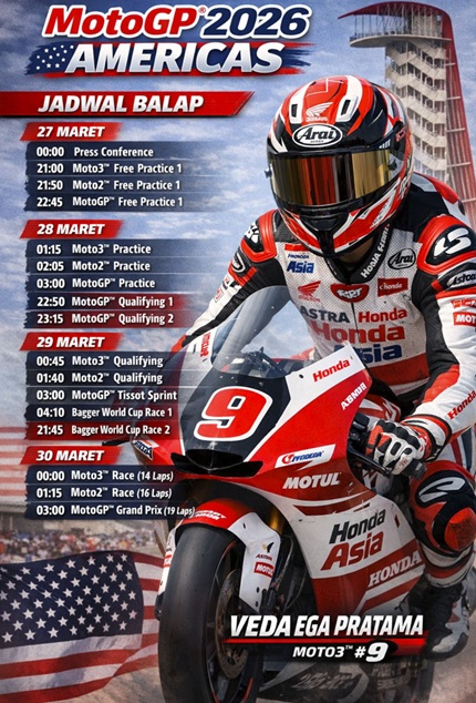 Penampilan Veda Ega Pratama di Moto3 menjadi perhatian publik Indonesia. Rider muda binaan Astra Honda ini diharapkan mampu bersaing dan meraih hasil positif pada seri Amerika.
